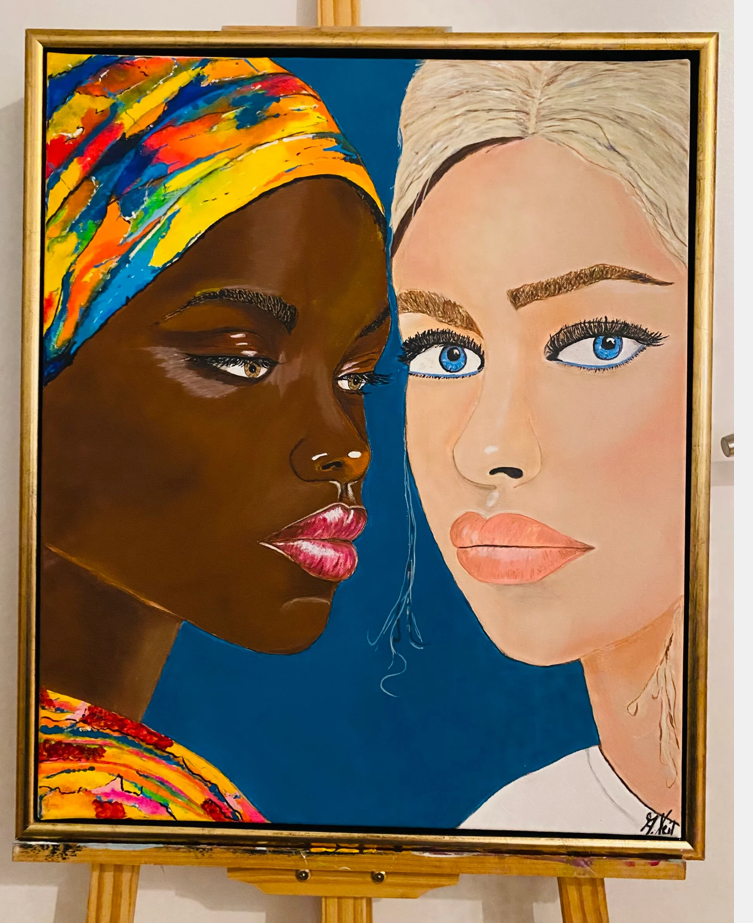 Portrait zweier Frauen aus verschiedenen Kulturen in inniger Pose.